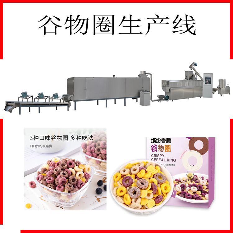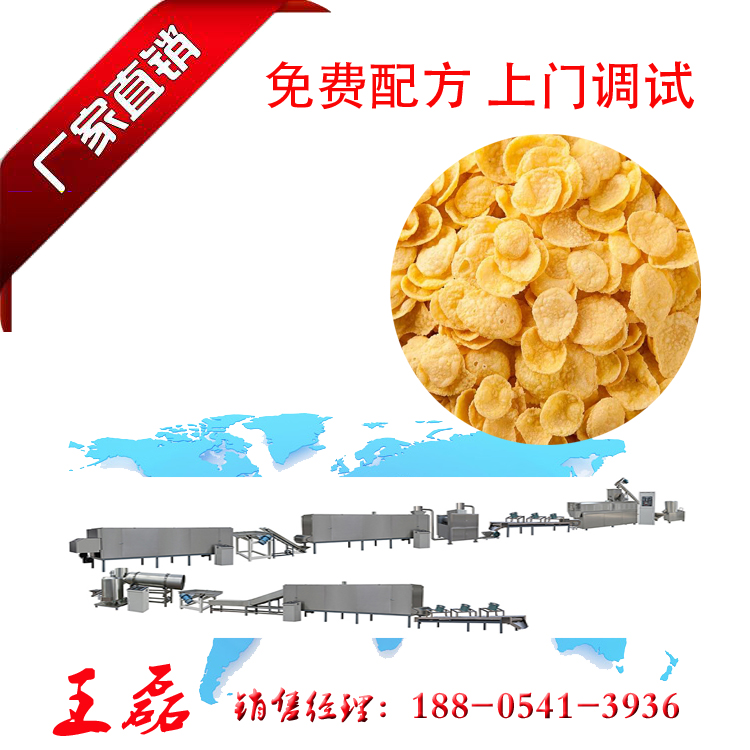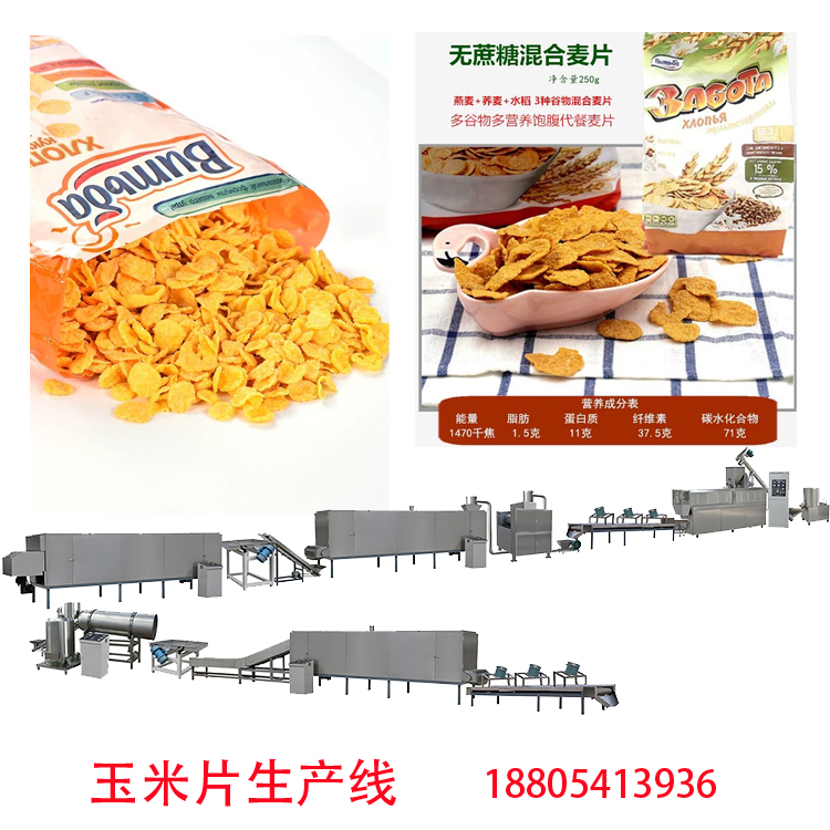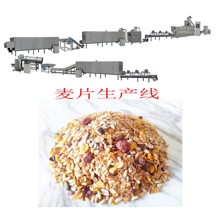 設(shè)備配置:拌粉機→上料機→雙螺桿膨化機→壓片機→風送機→多層電烤箱→冷卻輸送→(包裝機)