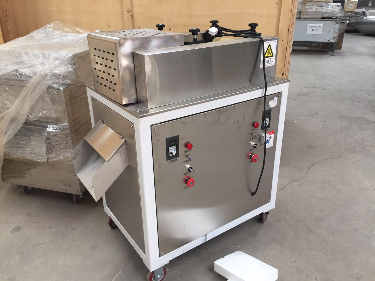 牽引切斷機(jī)具有牽引輸送和切斷兩種功能,一般用于切長條、長管等形狀小食品,像沙拉、薯?xiàng)l、圓管、圓圈等半膨化或非膨化食品。
